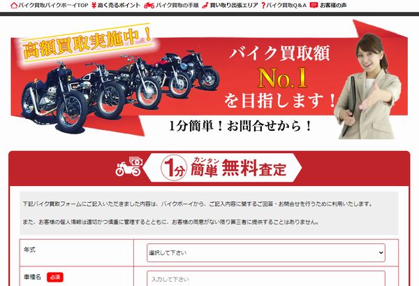 また、公式サイトにある「1分カンタン無料査定」では、バイクの年式や車種名、住所・氏名などを入力すると、おおよその買取金額の目安を教えてくれます。