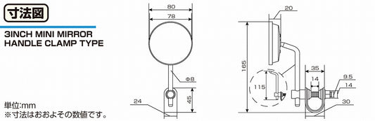 ミニミラー ハンドルクランプタイプ クロームメッキ 3インチ 1本 汎用