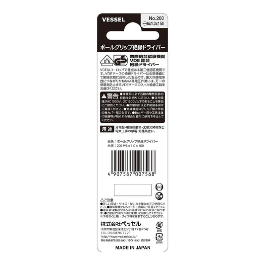 200 -6X1.0X150 ボールグリップ絶縁ドライバー