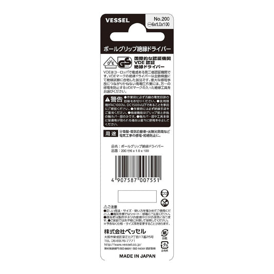 200 -6X1.0X100 ボールグリップ絶縁ドライバー