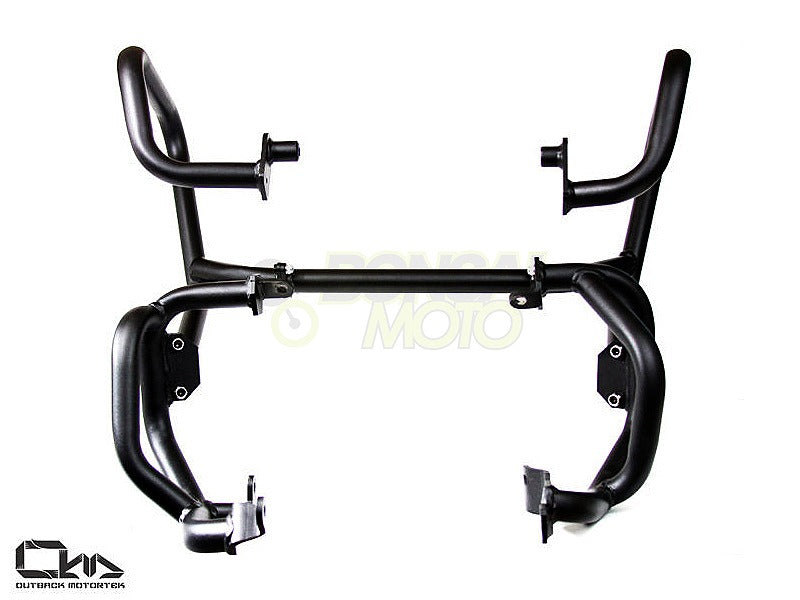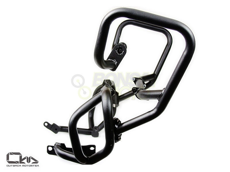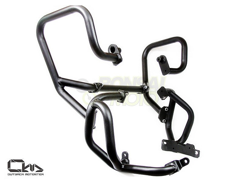 ・アウトバックモーターテックのクラッシュバーシステムの特徴は、厚5mmのスチールマウントタブに溶接された、カウル・ラジエター・エンジン等をガッチリ保護する直径27mmのチューブで構成される強靭さ。取り付けポイントからクラッシュポイントが近いコンパクトでタフなクラッシュバーです。 この構造により、タイガーのスポーティでアグレッシブなデザインを活かすことに成功しました。