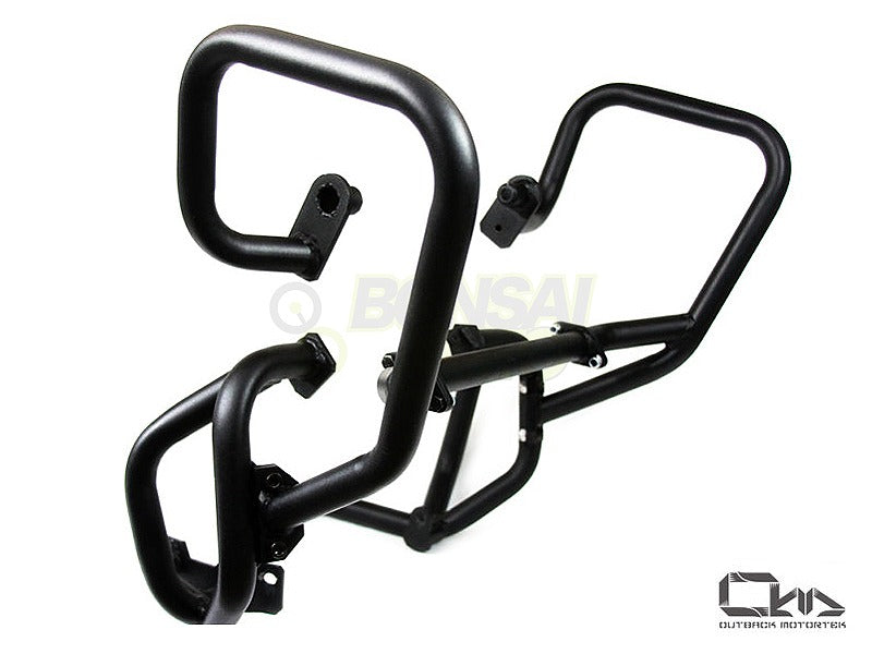 ・アウトバックモーターテックのクラッシュバーシステムの特徴は、厚5mmのスチールマウントタブに溶接された、カウル・ラジエター・エンジン等をガッチリ保護する直径27mmのチューブで構成される強靭さ。取り付けポイントからクラッシュポイントが近いコンパクトでタフなクラッシュバーです。 この構造により、タイガーのスポーティでアグレッシブなデザインを活かすことに成功しました。