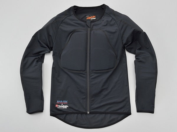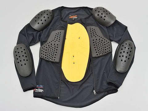 衝撃時に瞬間硬化するSAS-TEC製プロテクターを、胸部・ひじ・肩・背中に装備したインナープロテクター。