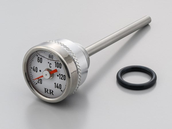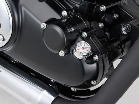 純正オイルフィラーキャップと交換して装着する、ディップスティックタイプの油温計。メーター内に封入したミネラルオイルは、文字盤の曇りを防ぐとともに、耐震性、耐熱性を発揮します。