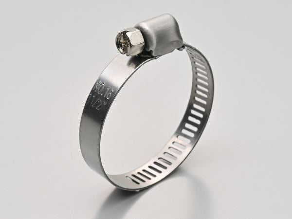 8mm幅のステンレス製バンド。鉄製ボルトの締め付けにより、幅広いホース径に対応。