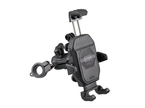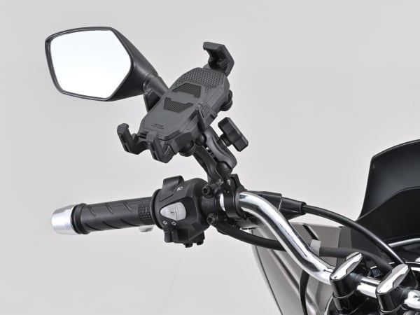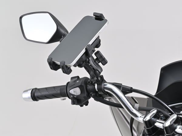 ボールジョイント機構により、自由度の高い位置調整が可能なスマートフォンホルダー。別売のオプション品と組み合わせることで様々な箇所へ取り付け可能。マウントとホルダー間に設けた振動吸収ダンパーと、アーム固定部の振動吸収クッションでスマホを振動から守ります。上下左右から5つの爪でスマホをガッチリ固定するから安心です。