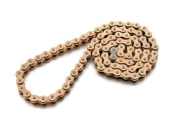 ・EKチェーン(江沼チヱン製作所製)を採用し、耐久性と更なる軽量化の両立を図りました。キンクしにくいソリッドブッシュタイプ。純正カムチェーンよりもリンクプレートが厚い25Hサイズはそのままに、ピン径を細くし軽量化。ピンには表面硬化処理(CRH・特殊クロマイジング処理)を施し、強度バランスも徹底的に煮詰めました。
