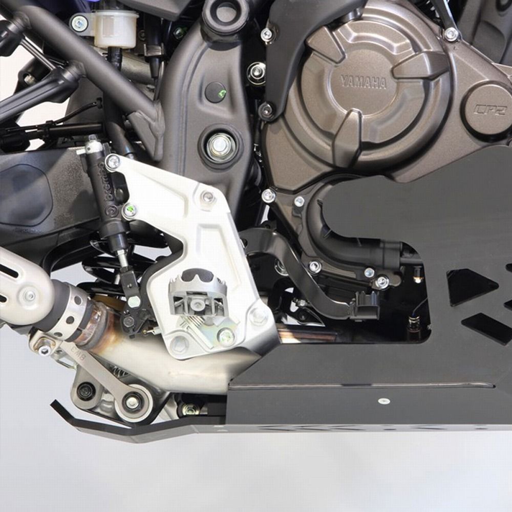 厚さ 8mmのHDPE(高密度ポリエチレン)を採用し、高い耐久性と軽量化を実現。柔軟性と強度を兼ね備え、金属製ガードのように衝撃によって変形してしまうこともない。装着はフレームの純正マウント(4ヶ所)と、付属のプラスチックステーによってスキッドプレートをしっかり固定。大きな衝撃が加わった際にはエキゾーストパイプやフレームをしっかりと保護。ウォーターポンプ、サイドスタンドセンサー、エンジンケースだけでなくリンクまで保護する一体構造のため確実で強力なガード性能を提供する。