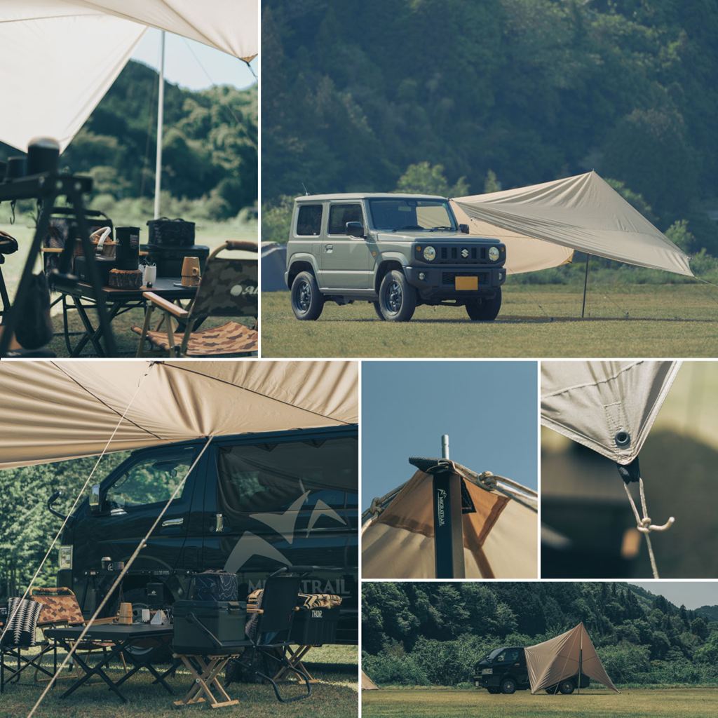 車と連結しタープの形状を多彩な設営バリエーションに合わせ、日陰やプライベート空間をコントロール。