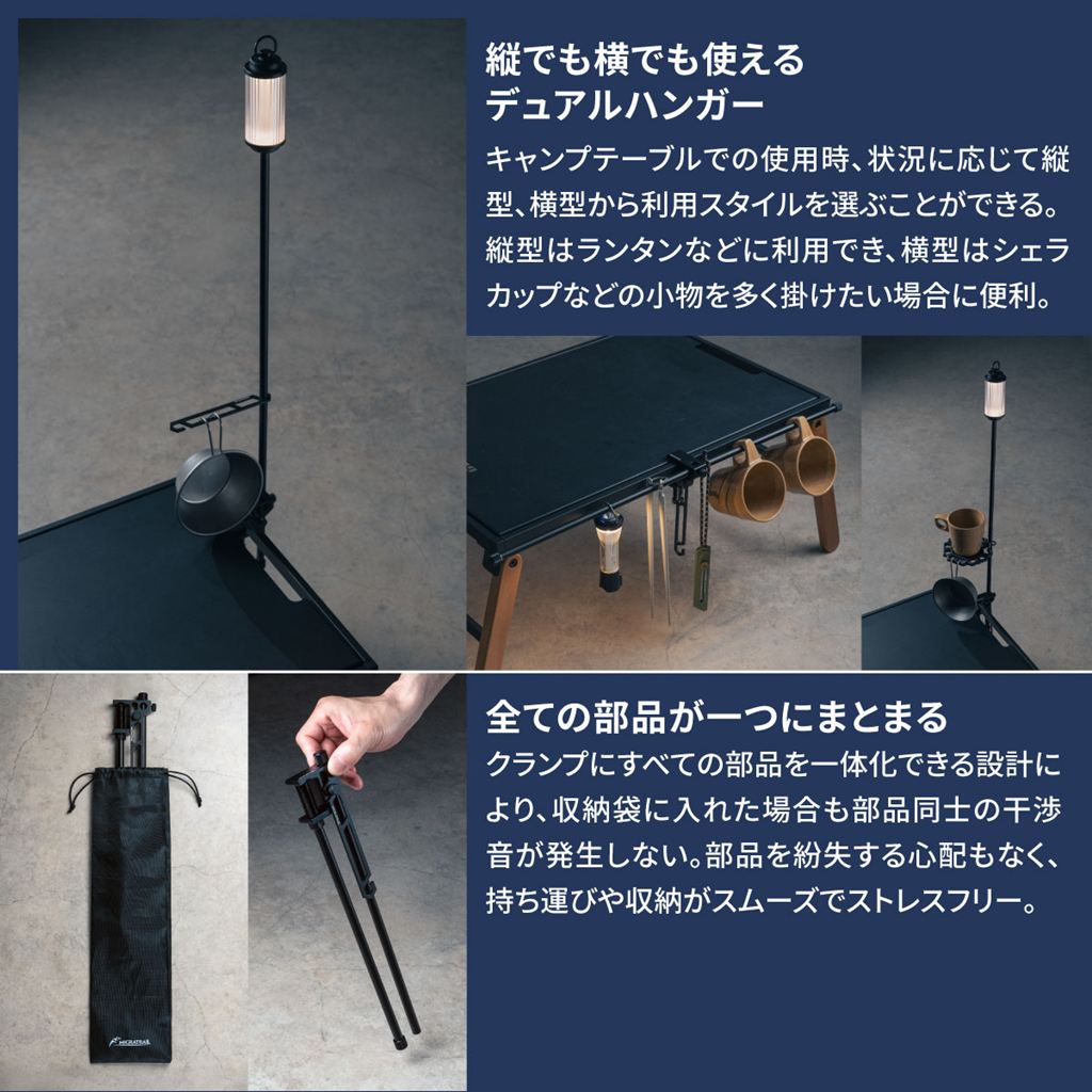 アウトドアでもリビングでも、どこでもフィットするテーブルクランプ型ランタンハンガー。