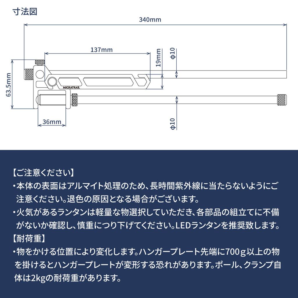 ※耐荷重は物をかける位置により変化します。ハンガープレート先端に700g以上の物を掛けるとハンガープレートが変形する恐れがあります。ポール、クランプ自体は2kgの耐荷重があります。