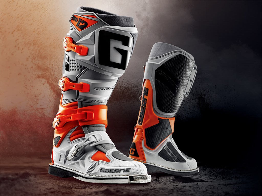 【ガエルネ SG-12 オレンジ/グレー/ホワイト バイクオフロード 靴 ブーツ シューズ】独自のデュアル ステージ ピボット システム、フローティング・シンガード、専用ソールを搭載。ガエルネ最高峰のMXブーツ。