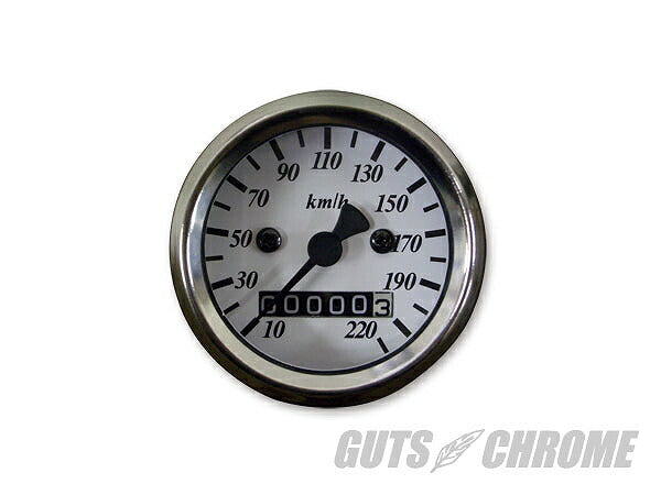 48mm スピードメーター 白 2:1 機械式 220km 照明電球 ステンレスボディ トリップ無し ケーブル取付部12mm カスタム車輌にどうぞ。取り付けステーつきです。●メーカー:GUTS CHROME●OEM品番 :-●Made in TAIWAN