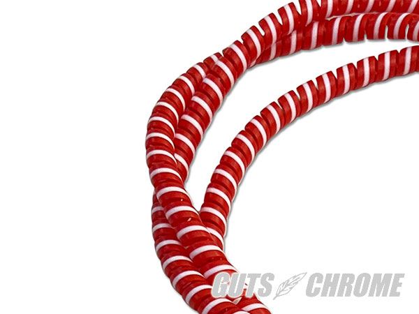 ■商品説明 時は1955年PANHEADがFLからFLHになるころハーレーのオプションパーツに新たなケーブルラップが加わりました。 1955年からの新製品はナックルの時代のもこもこしたタイプとは異なり板状の形状に真ん中部分が白くなったスタイルとなりました。 ケーブルコイル(ケーブルラップ)はビンテージハーレーやカスタム車両のドラムケーブルやプラグコードなどのドレスアップに非常に手軽でオススメなアイテムですが当時のハーレー純正ケーブルラップはすでに枯渇状態でもしE-BAYなどで出てきても200ドル以上などで非常に高価で現在ではまず出てこないシロモノでした。 現在でもメッキタイプはレプリカがVTWINで販売されており入手できますが、その他の純正で販売されていたホワイトを真ん中にした2色カラータイプはまず手に入らない状況でした。 なんとかHDオプションパーツのケーブルラップを復刻できないかと長年思い描いておりましたが、人づてにやっと生産できるところを見つけることができやっと製造までこぎつけることが出来ました!! まずは当時のオプションパーツリストの復刻版を入手し正確に品番とカラーの組み合わせを把握するところから始まり実際の生産にあたっては当時のオリジナルの黒/白の切れ端を入手し黒と白の色の比率数値をとり、現代のケーブル系に使いやすいように寸法は若干大きめに生産しております。 仕様 用途:クラッチケーブル/油圧のブレーキケーブル/ドラムのブレーキケーブル/プラグコードなど カラー:赤×白 外径:約10mm 内径:約8mm 板幅:約7mm 全長:約145-150cm