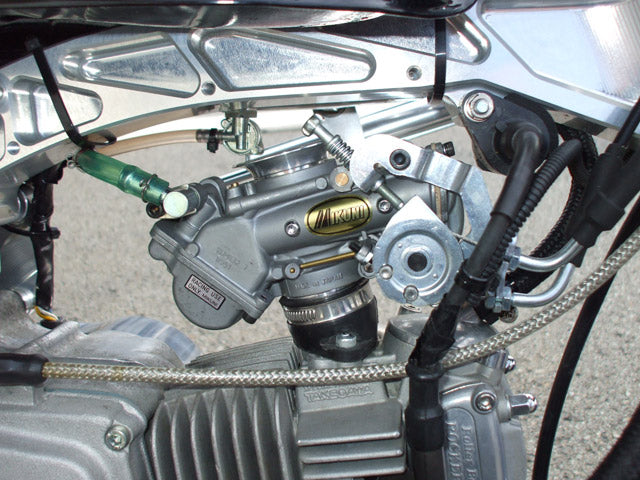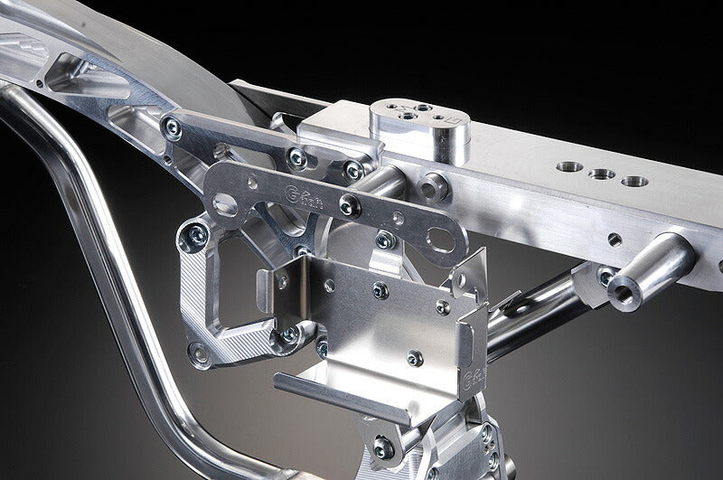 ●フレーム重量5.9kg(ノーマル4.9kg)エンジン搭載位置を7mmチェーン側に移動でき、オフセットスプロケットを使用せずNSR50/80ホイール、10インチ4Jホイールが使用できます。そのため大排気量のカウンターシャフトの摩耗やフィキシングプレートの摩耗が少なくなります。(バックステップの専用ステーを7mmチェーン側に移動させる事が出来ます。)