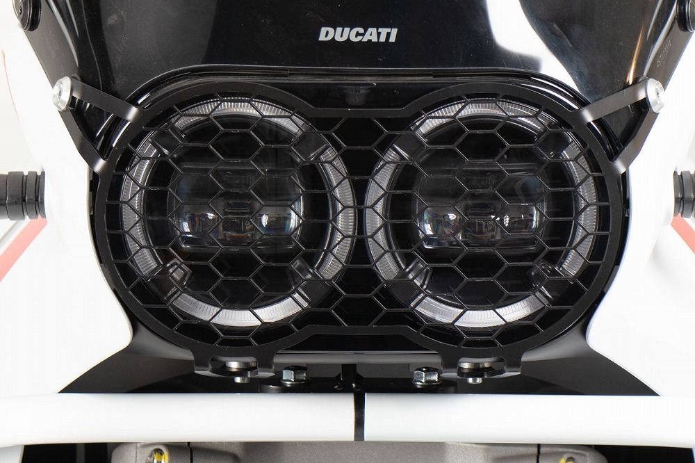 悪路での不意のアクシデント、木々等との接触等の際のヘッドライトレンズを損傷から保護する鉄製のライトグリルです。