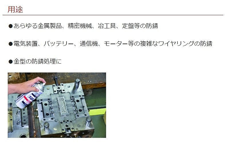 水置換性で、あらゆる金属の防錆に使用でき、金属表面を浸したり、色を変えることはありません。