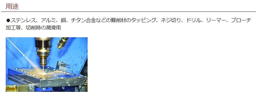 ステンレス、アルミ、銅、チタン合金などの難削材のタッピング、ネジ切り、ドリル、リーマー、ブローチ加工等、切削時の潤滑用