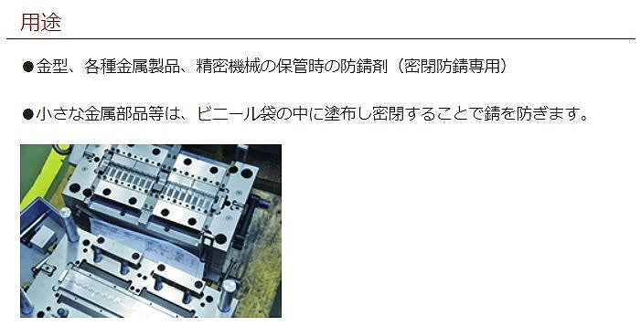 金型、各種金属製品、精密機械の保管時の防錆剤(密閉防錆専用)