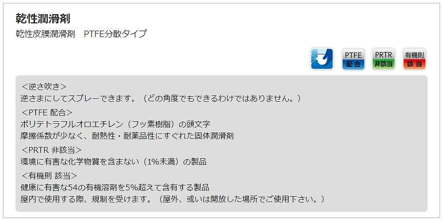 乾性皮膜(PTFE粉)なので、ベトつかずホコリなどが付着しにくい。