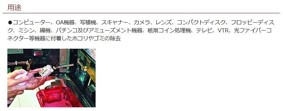 コンピューター、OA機器、写植機、スキャナー、カメラ、レンズ、コンパクトディスク、フロッピーディスク、ミシン、編機、パチンコ及びアミューズメント機器、紙幣コイン処理機、テレビ、VTR、光ファイバーコネクター等機器に付着したホコリやゴミの除去