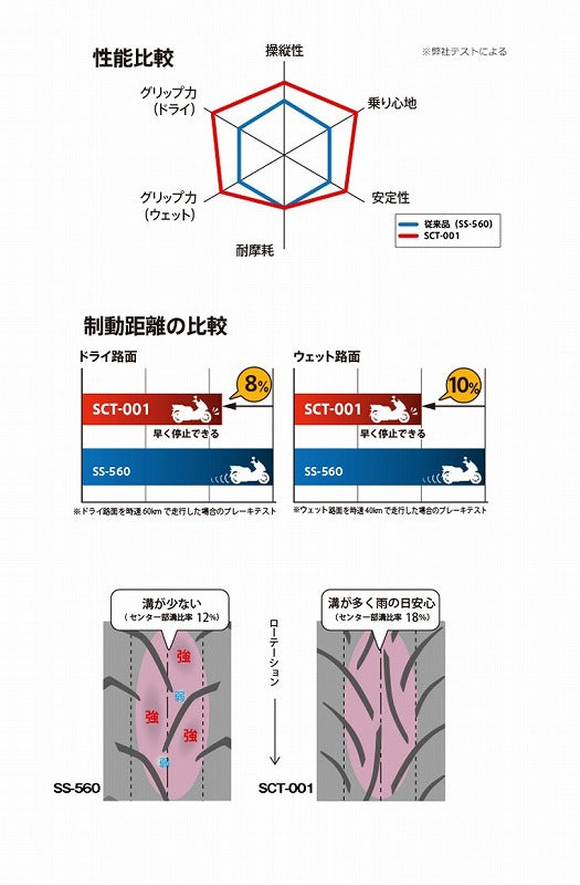 ・従来品に比べドライ路面で約8%、ウェット路面で約10%の制動性能アップをテストコースで確認。