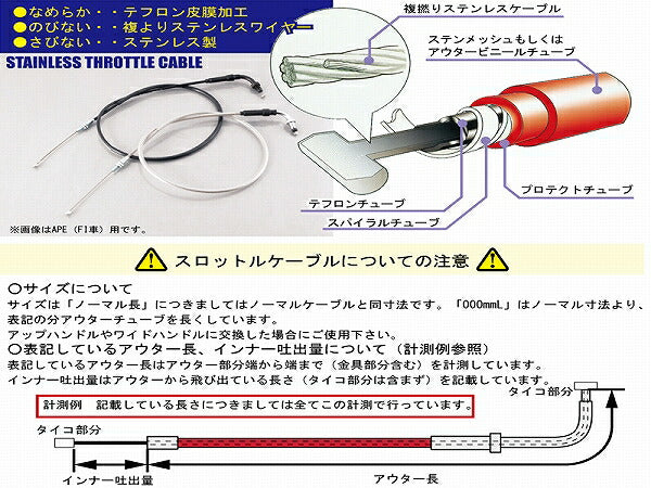 ステンレスケーブルはインナーケーブル高密度の複撚り(7 × 7=49 本)に仕上げ、高張力加工、表面特殊加工を施した為、表面の凹凸が少なく、テフロンチューブ内蔵により、摩擦を減少させ、非常に滑らかなクラッチ、スロットルワークを実現しています。