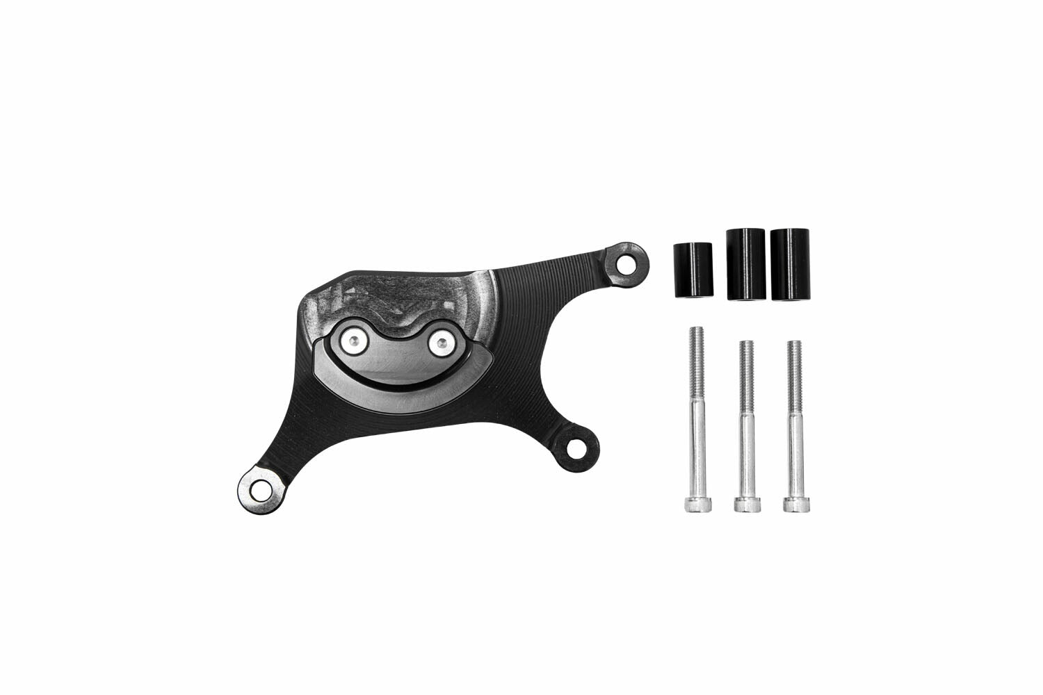 モリワキ製ケースガード最大のポイントはバックマウントの樹脂パーツ、万一の転倒時も路面側/エンジン側共にファーストタッチは樹脂部分となります。