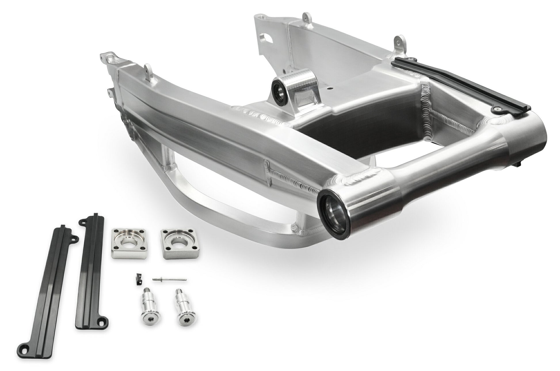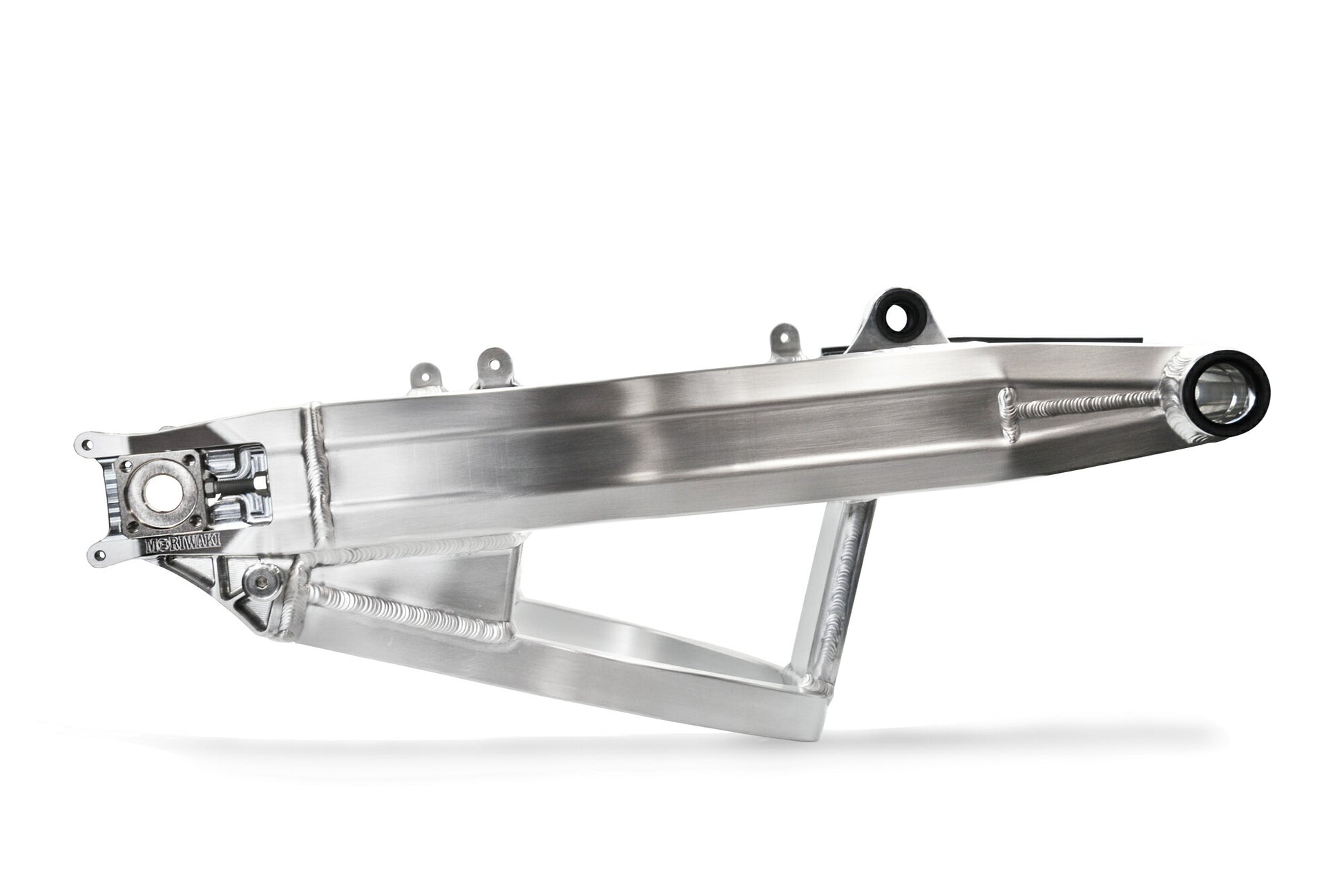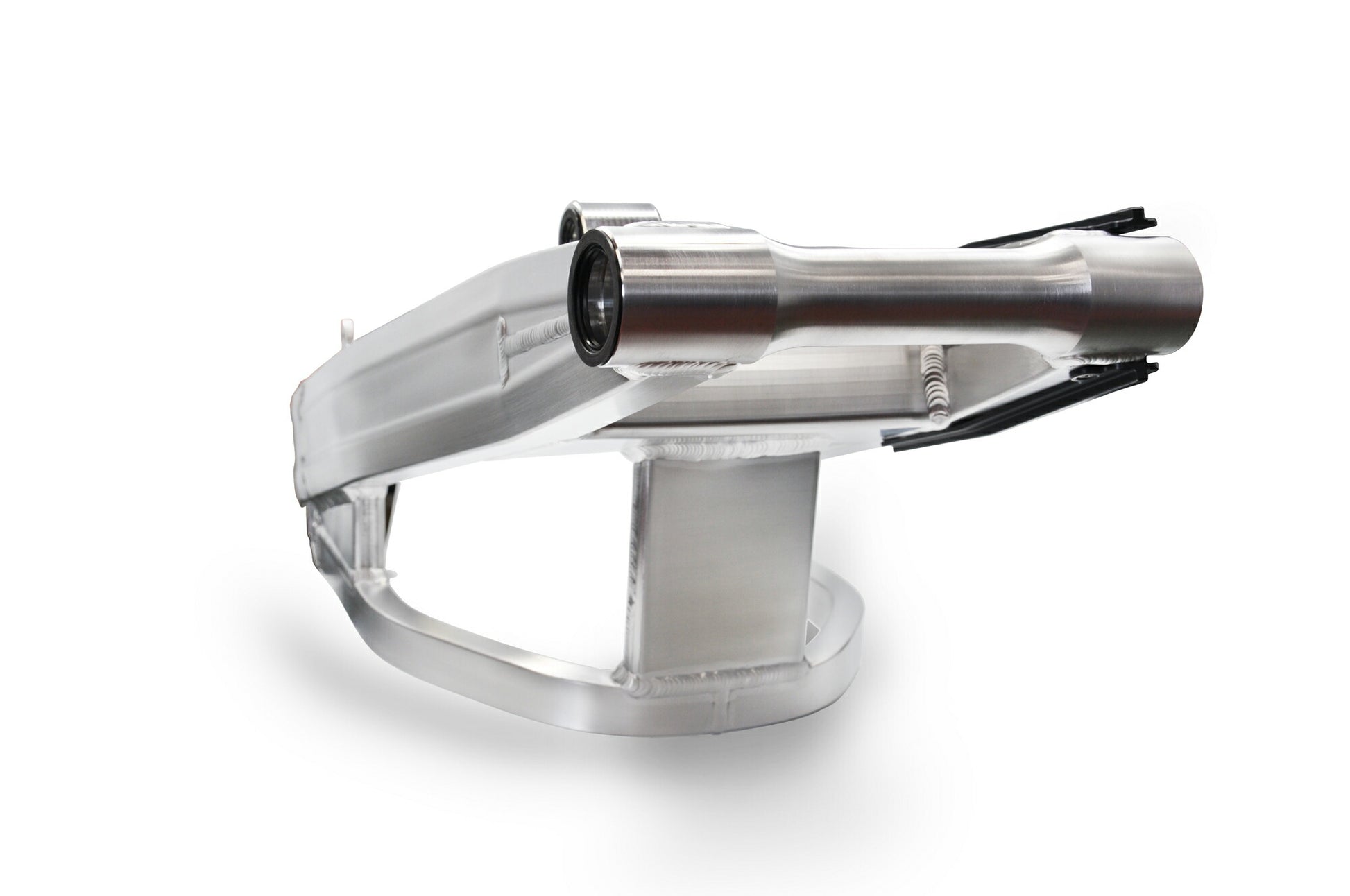 ・高剛性かつ高精度の削りクロスパイプとエンドピース、スイングアーム単体で軽量でありながら剛性バランスを確保するため、各削りパーツにスタビライザーがアクセスする設計となっています。