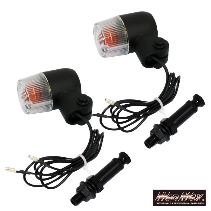 【マッドマックス MM11-0077-CL 丸型ミニヨーロピアンウインカー M10×73mm/アルミ製取付ステー付 ブラック/クリア 2個セット 汎用 ウィンカー 指示器】