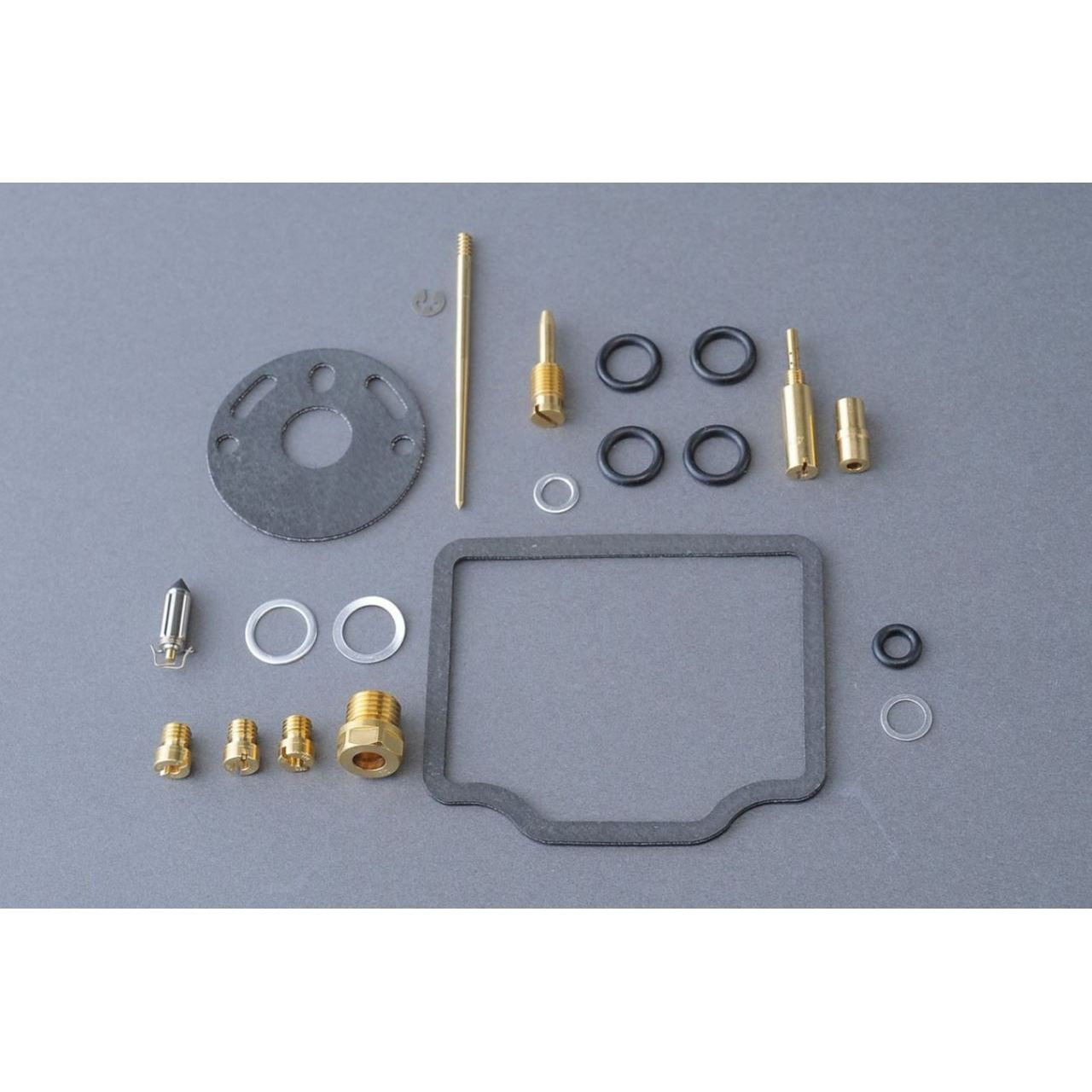 キット内容はトップワッシャー、ジェットニードル、平ワッシャー×2個、エアースクリュー、7.9×1.9mmOリング、スロージェット、ニードルジェット、メインジェット(#110、#115、#120)、フロートバルブセット、フロートチャンバーワッシャー、6mm平ワッシャー。以上14種をセット。