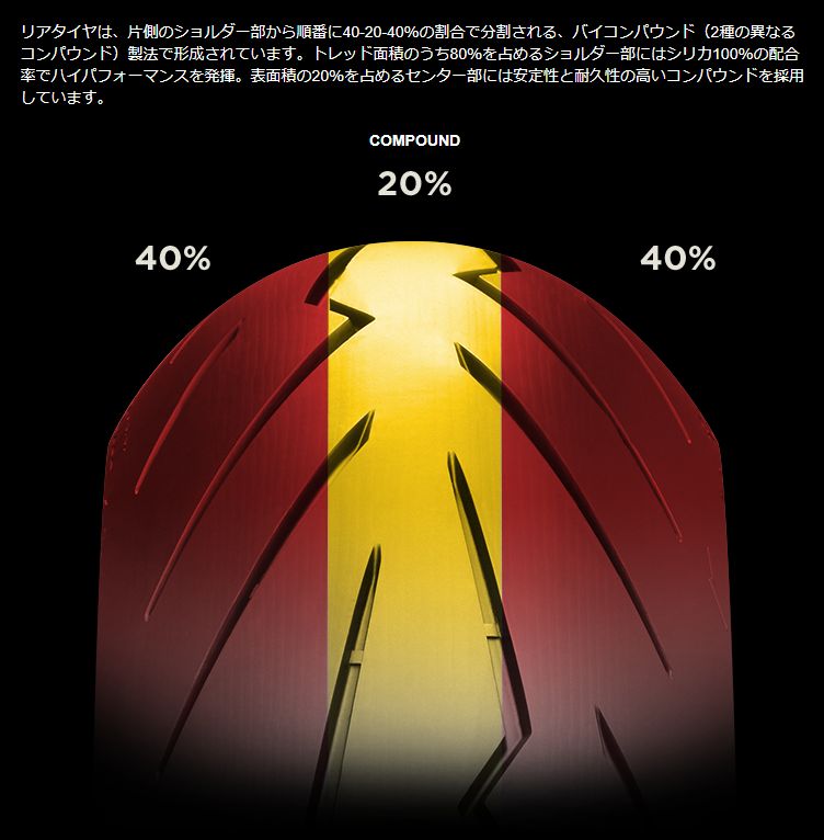 ・よりソフトなトレッドを持つショルダー部を広くとるバイ・コンパウンド製法は、スタートから中間程度までのリーン・アングルで最高のグリップ力を発揮