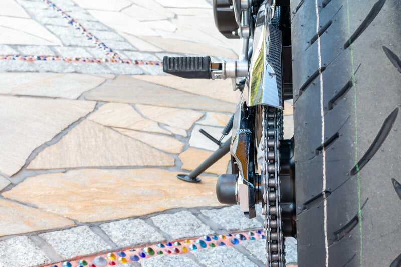 ・STDのチェーンカバーを兼ねたデザインを踏襲しながら約120mm後方に延長することで、泥跳ねや水撥ねを大幅に軽減すると共に、 テールカウルとタイヤとの「隙間感」を無くす事で、より一層攻撃的でレイシーなリアビューを飾り上げます。