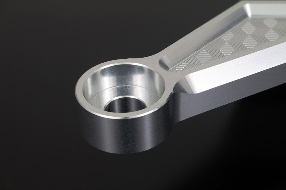 ・贅沢にも40mm厚のA2017超ジュラルミンブロックから二段構造で削り出された3ポイントプレートは驚異的な高剛性を実現。 プレート傾斜部はあえて切削痕を残したノッチドフェイスを採用することで上下にあしらわれる特徴的な多重六角形のハニカムデザインをより際立たせエンジンサイドビューに圧倒的な存在感を与えます。