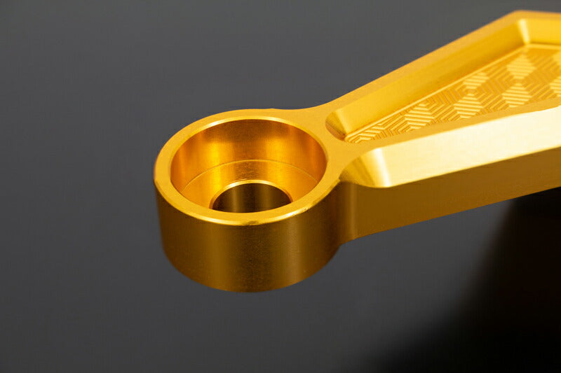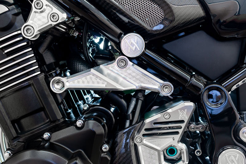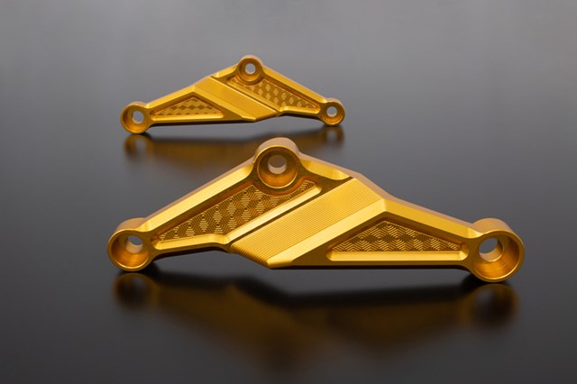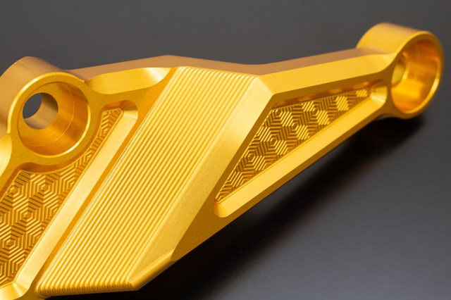 ・贅沢にも40mm厚のA2017超ジュラルミンブロックから二段構造で削り出された3ポイントプレートは驚異的な高剛性を実現。 プレート傾斜部はあえて切削痕を残したノッチドフェイスを採用することで上下にあしらわれる特徴的な多重六角形のハニカムデザインをより際立たせエンジンサイドビューに圧倒的な存在感を与えます。