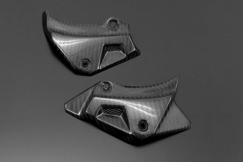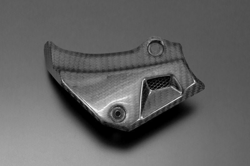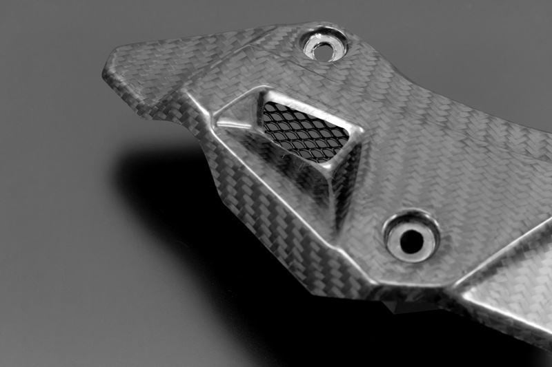 メインハーネスから計器類へと接続される配線の目隠しと共に、エアークリーナーボックスへの吸気エアー導入口を兼ね備えたステムヘッドカバーを、無機質なプラスチック製からカーボンファイバー製に交換することで、一見して抜群のドレスアップを実現。
