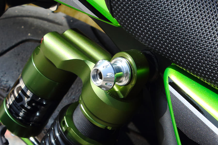 ・リアサスペンションのフレーム側ナットと付け替えるジュラルミン製マウントフック。