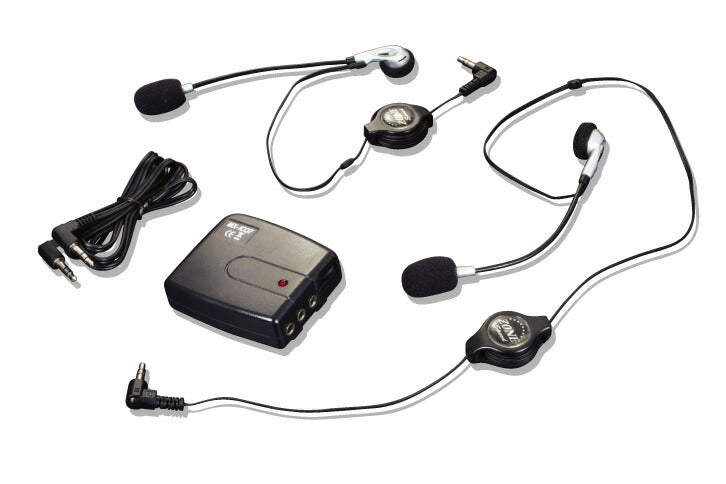 ・本体にはオーディオ接続用プラグ付属。マイクやスピーカーは長さを調整できるコードリール式。単四電池2本で最長200時間使用できます。