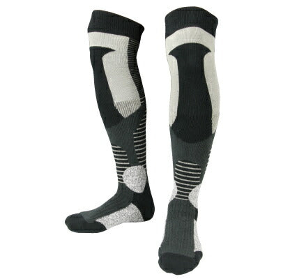 ・ドイツ バイエルン社が開発した乾式アクリル繊維、ドラロンの吸汗/速乾効果により、汗/ムレによる湿気を発散し、さらさら快適なだけでなく、抗菌防臭加工(抗菌防臭ロンフレッシュ加工)により汗によるにおいを抑えます。さらに足の部位に応じた特殊な編み方、厚み、テンションにより設計された革新的なライディングソックスです。ドラロンはピリングになりにくい性質も持っており耐久性にも優れます。まさにニーシンガード、ニーブレースの装着時のベースソックスに最適な組成のオーバーニータイプソックスです。