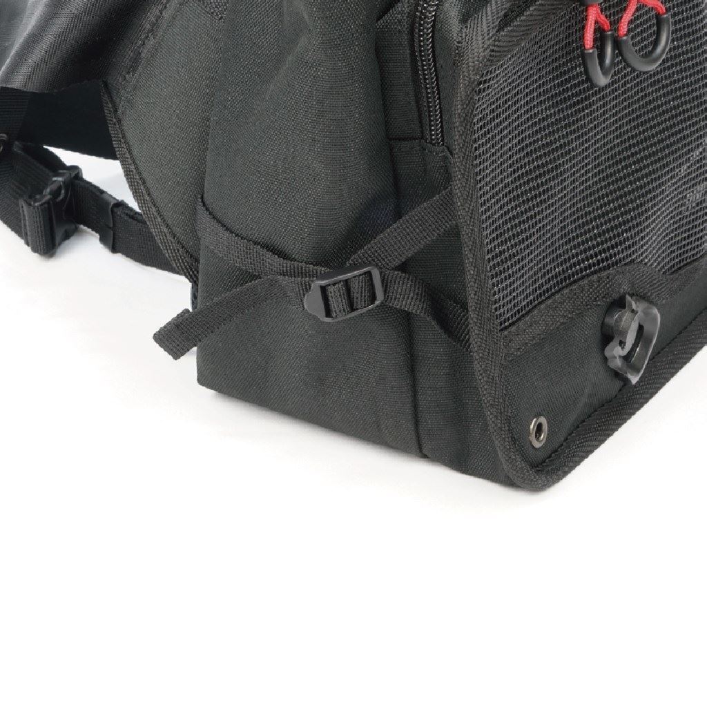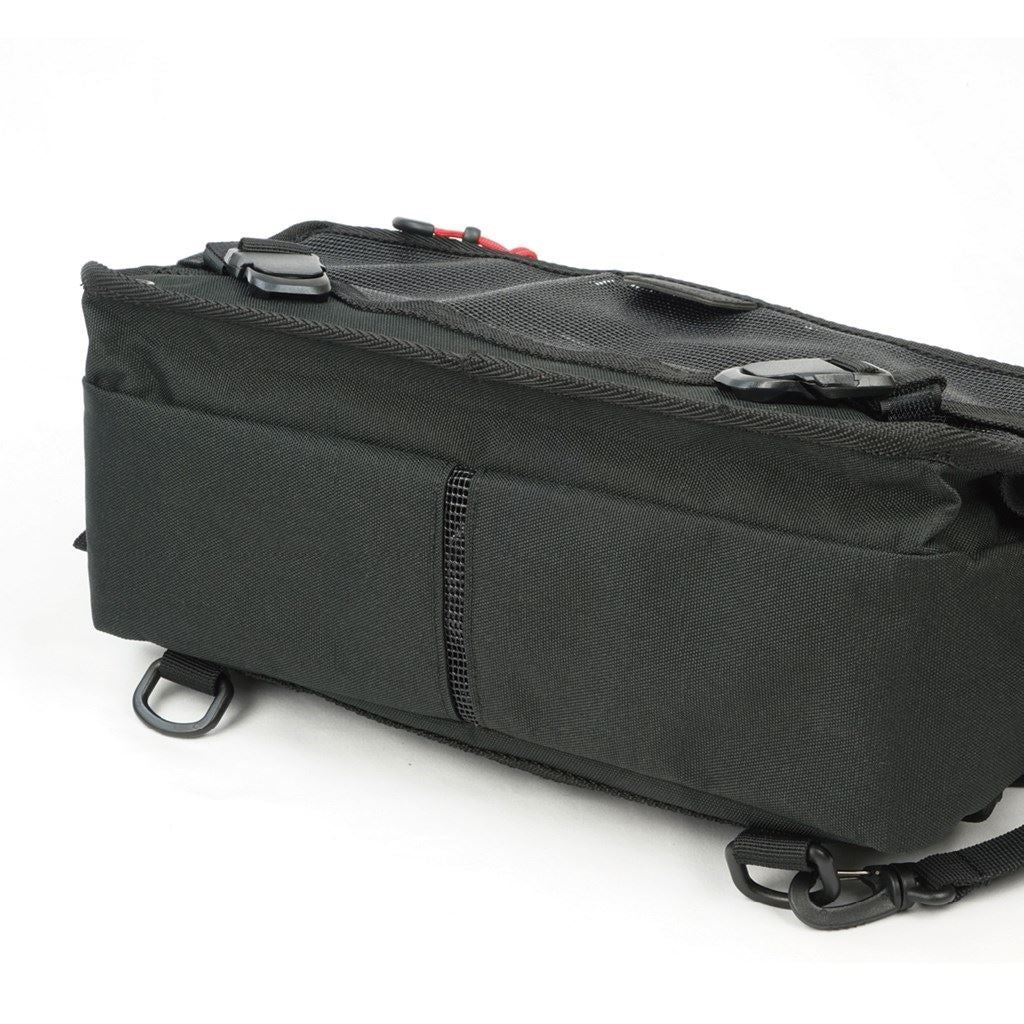 右掛け左掛け両用を考量したシンメトリー設計でユーザーを選ばず、メッシュポケットと大型ファスナーポケット(非防水)を備えた補強板入りフロントパネルをサイドのテンションベルトで調整することで、シルエットを崩すことなく荷物の増減に対応しバッグの安定感を高めます。