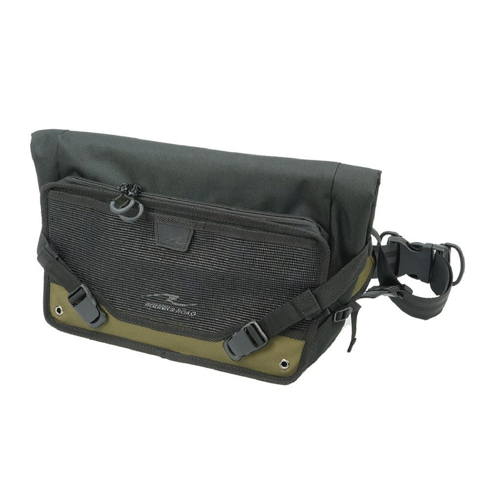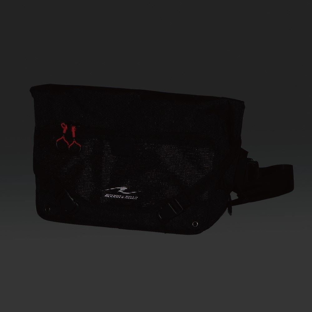 右掛け左掛け両用を考量したシンメトリー設計でユーザーを選ばず、メッシュポケットと大型ファスナーポケット(非防水)を備えた補強板入りフロントパネルをサイドのテンションベルトで調整することで、シルエットを崩すことなく荷物の増減に対応しバッグの安定感を高めます。