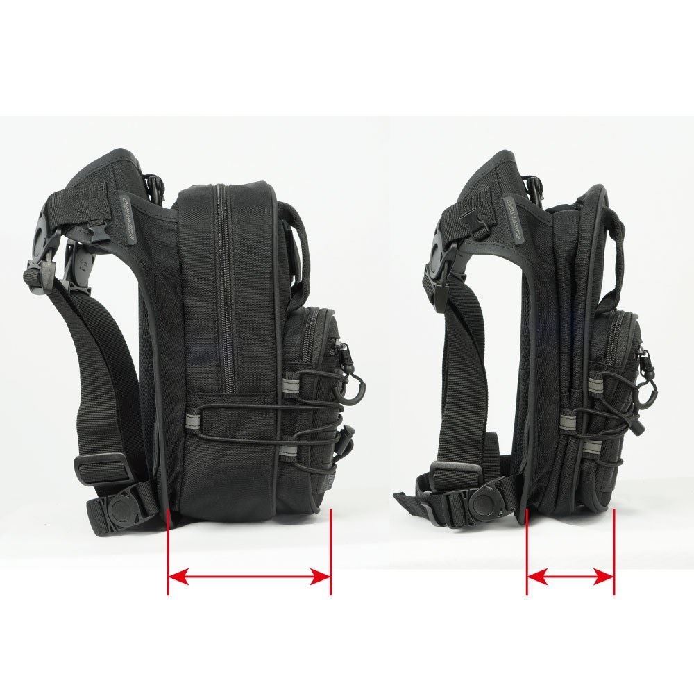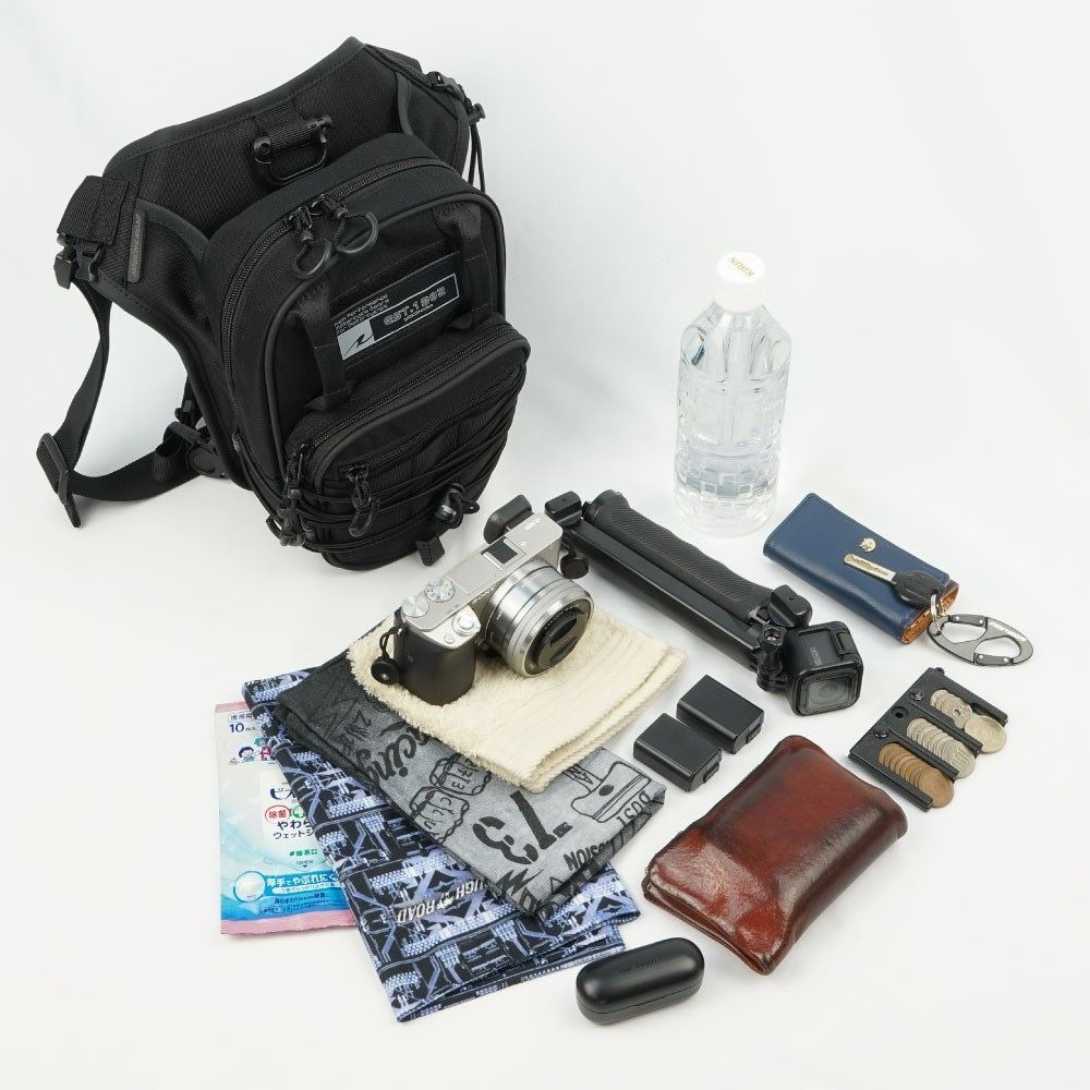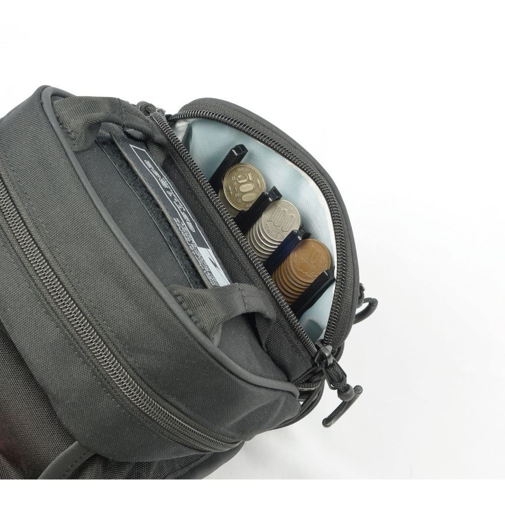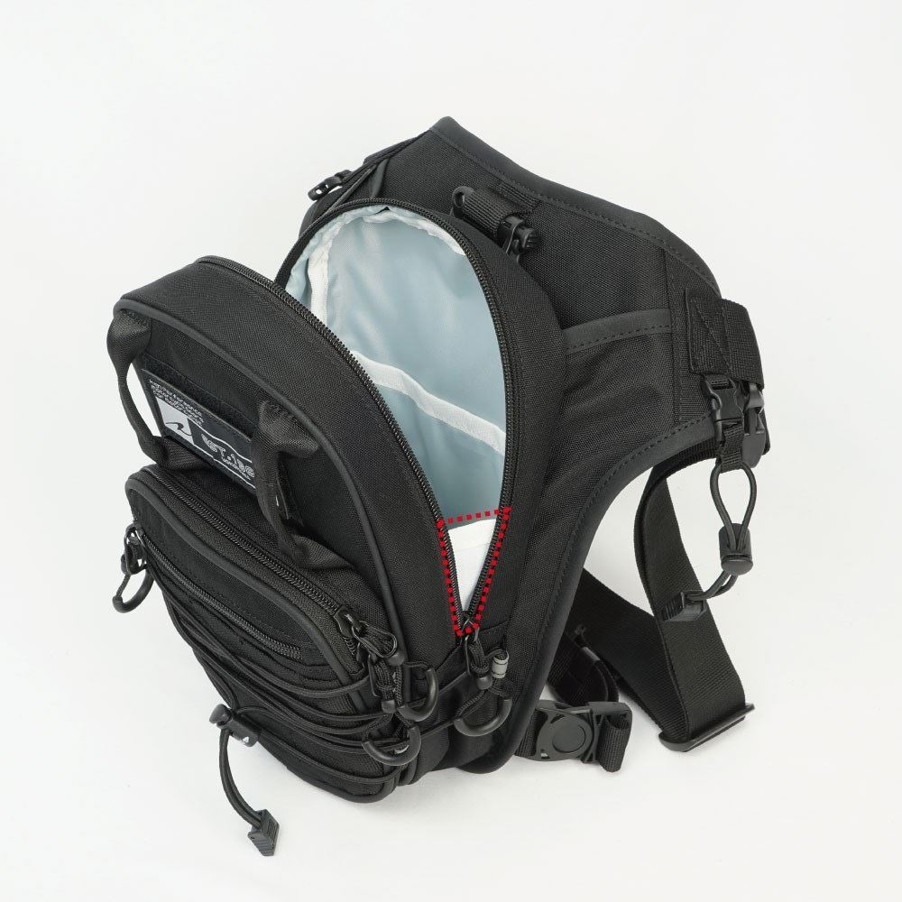 入り口から底部まで同じ厚みを確保したメインスペースは無駄なく荷物を収納できます。各機能をできる限り左右両用となるよう設計し、右足左足どちらでもお好みに合わせて着用可能です。