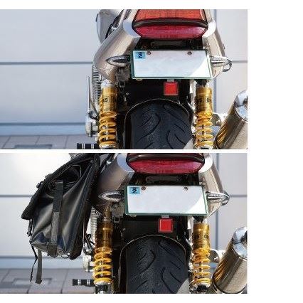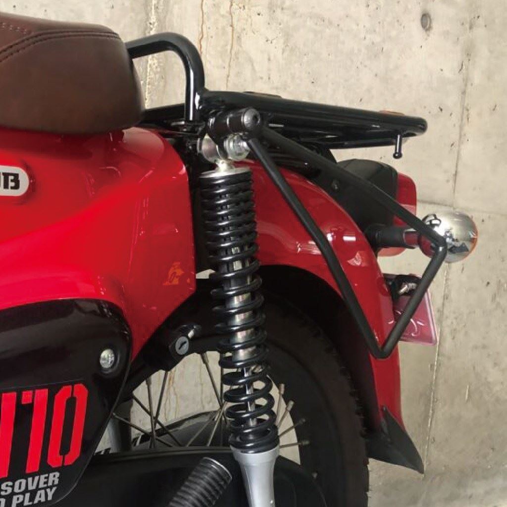 サイドバッグの積載時の車体とのスレ防止、タイヤへの干渉はもとより危険な巻き込みをふせぎます。車体への接続部を可変ピースにすることで取り付け自由度が高く、サポート本体も角度をつけた取り付けが可能。