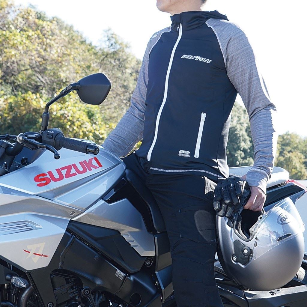 ストレッチ性と高い通気性があるメイン素材に吸水速乾、UVカット、肌に優しく滑らかな仕上げのアイスムースを採用した機能性パーカー。袖口にはサムホールを備え、グローブとジャケットの隙間の「グローブ焼け」を防ぐ紫外線対策仕様になっています。またフードを被ったままヘルメットをかぶれば、首の日焼け防止とともにヘルメットの内装の汚れ防止にもなり一石二鳥。