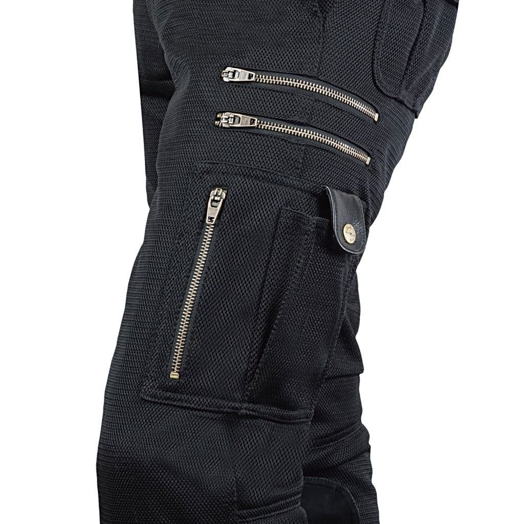 ジッパーポケットを効果的に配置し、通常ポケットも含めるとなんと12か所のポケットを装備した多収納が可能なメッシュパンツ。 これだけのポケットを備えつつも、スマートなストレートシルエットで着用シーンを選びません。 ニーグリップで擦れやすいズボンの裾は、アジャストフラップも兼ねた牛革製ヒートガードをしっかり装備して補強しました。 ストリートからアウトドアまで幅広くカバーするライディングメッシュパンツです。
