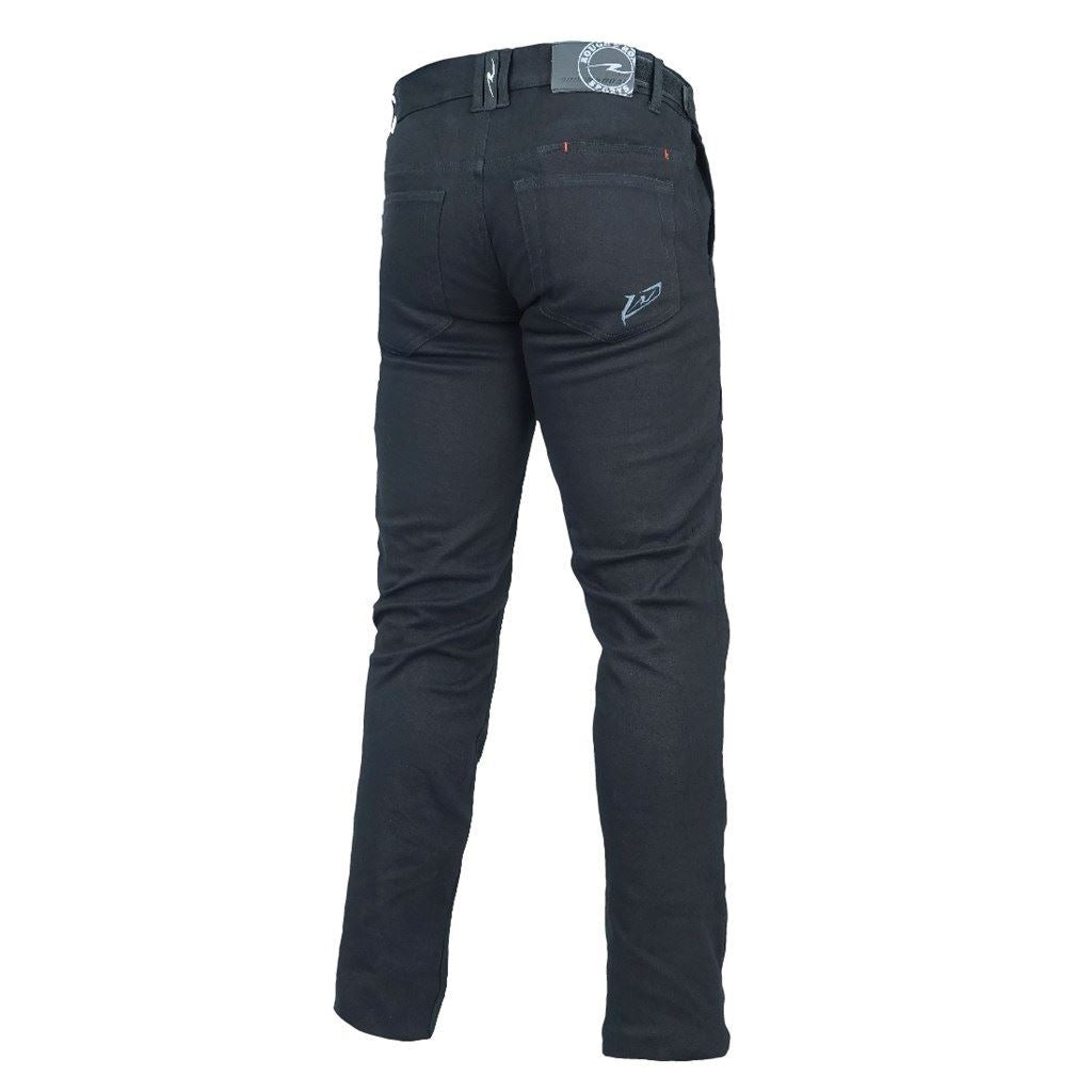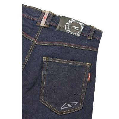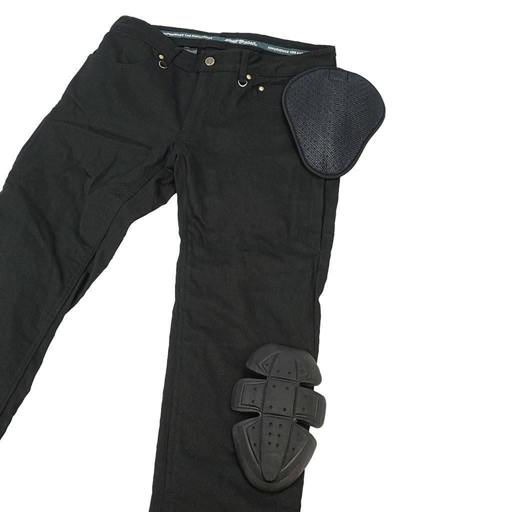 バイク乗りの定番スタイル、デニムジーンズに、ニーシンガードウエストパッドを標準装備。