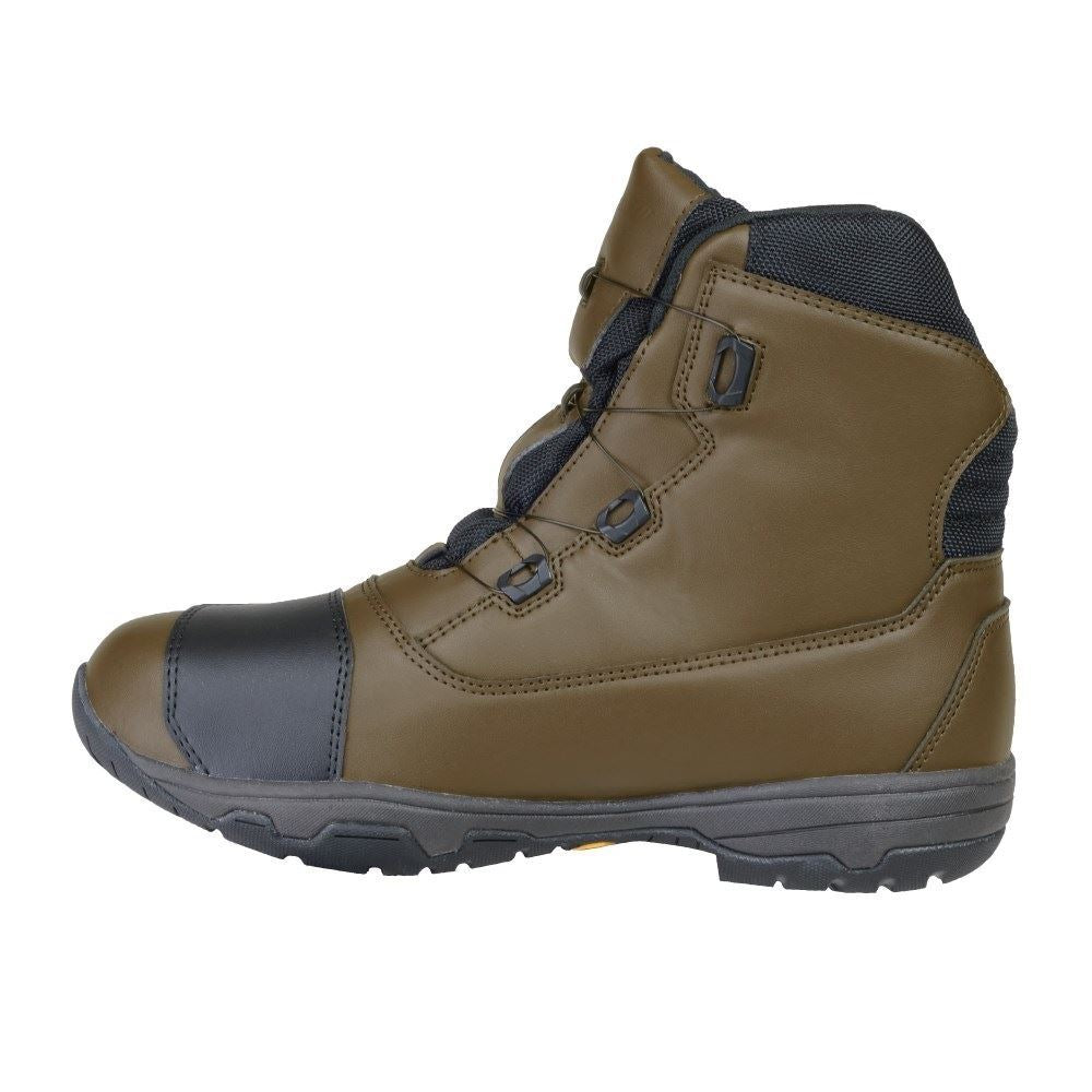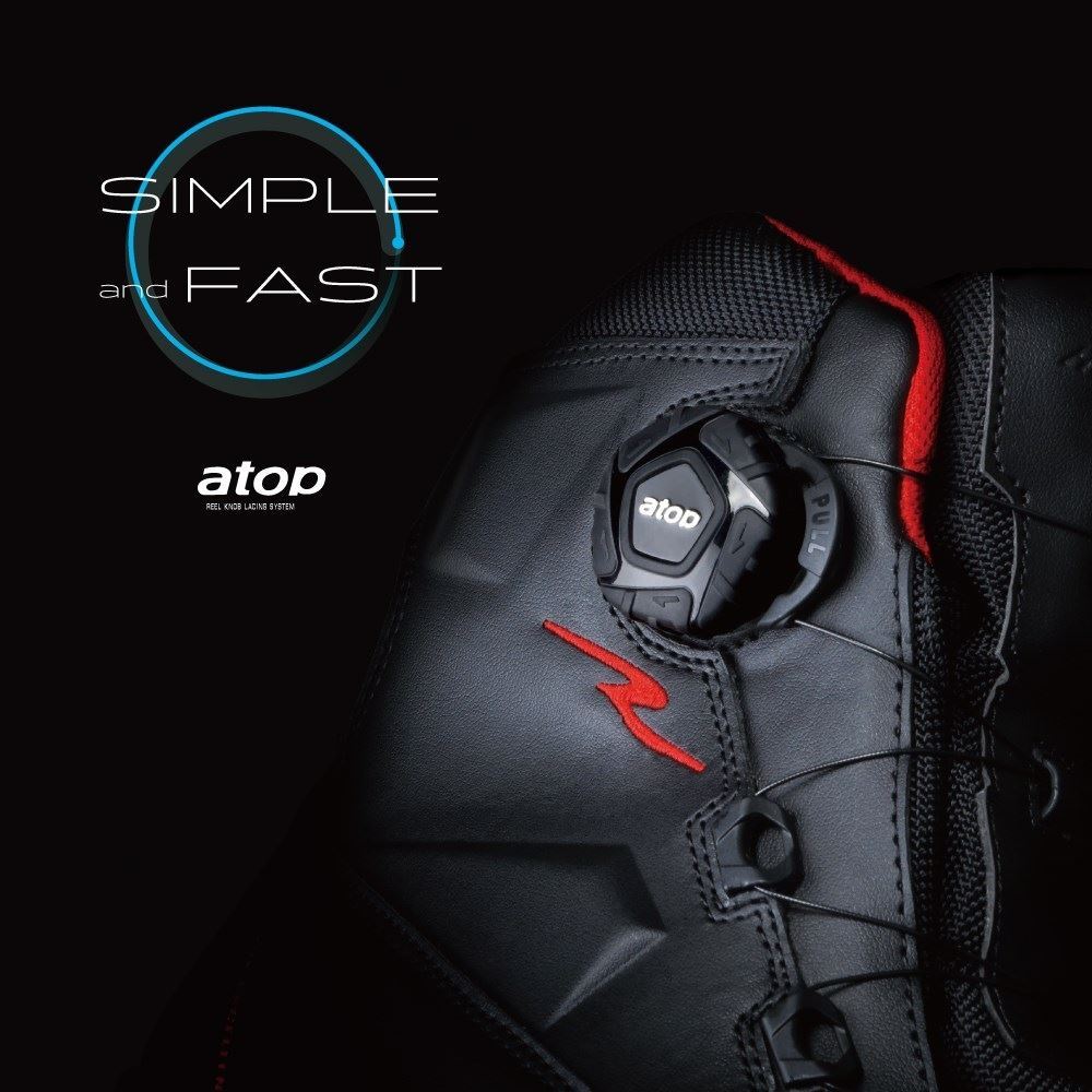 圧倒的にスピーディな着脱を可能にするダイヤルワイヤーシステム「a-top」、アウターソールのトップブランド「Vibramソール」のうちモーターサイクルに最適なものを採用した、ラフアンドロードが送る防水透湿ライディングシューズ。デザインされた幅広シフトパッドや被視認性を高めるリフレクター、整形くるぶしガードなどを装備したハイカットブーツでありながら、片足でわずか500g以下の超軽量化を実現しました
