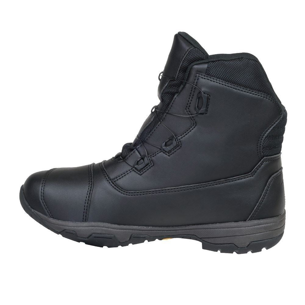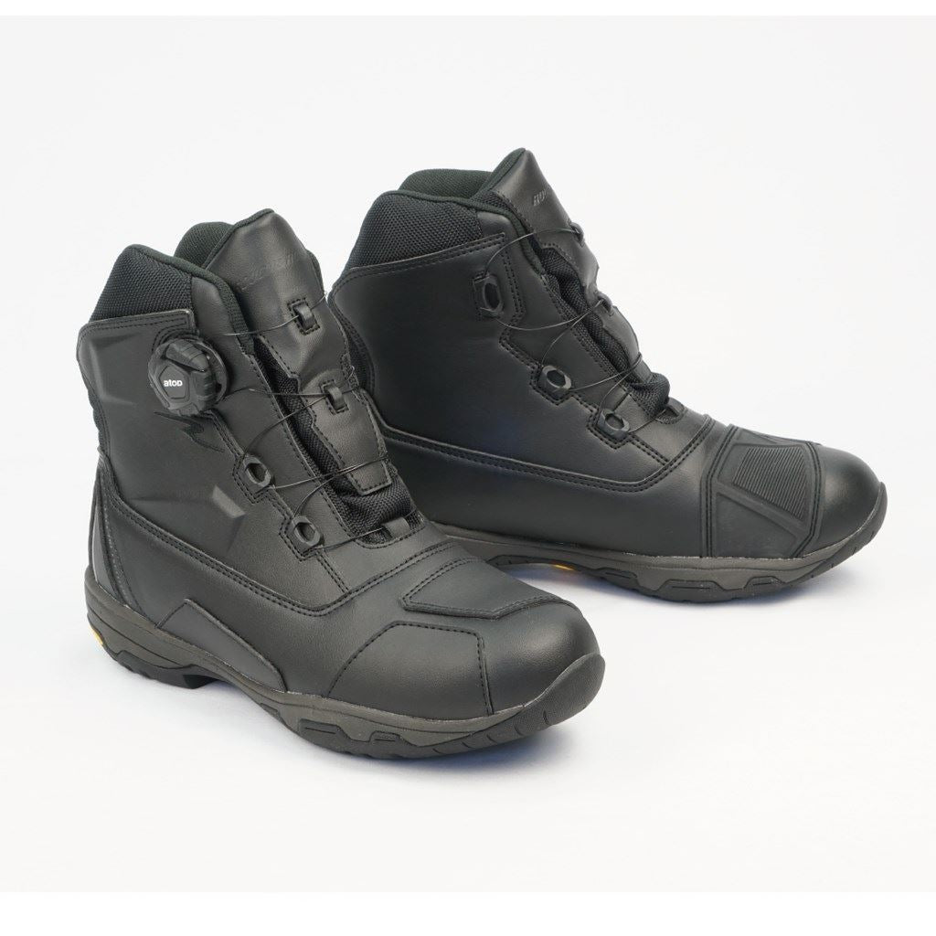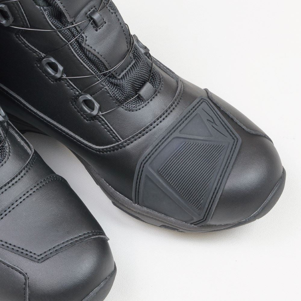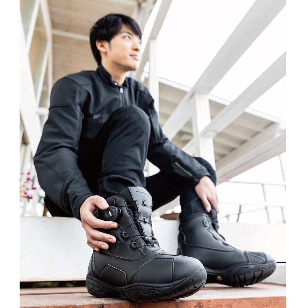 圧倒的にスピーディな着脱を可能にするダイヤルワイヤーシステム「a-top」、アウターソールのトップブランド「Vibramソール」のうちモーターサイクルに最適なものを採用した、ラフアンドロードが送る防水透湿ライディングシューズ。デザインされた幅広シフトパッドや被視認性を高めるリフレクター、整形くるぶしガードなどを装備したハイカットブーツでありながら、片足でわずか500g以下の超軽量化を実現しました