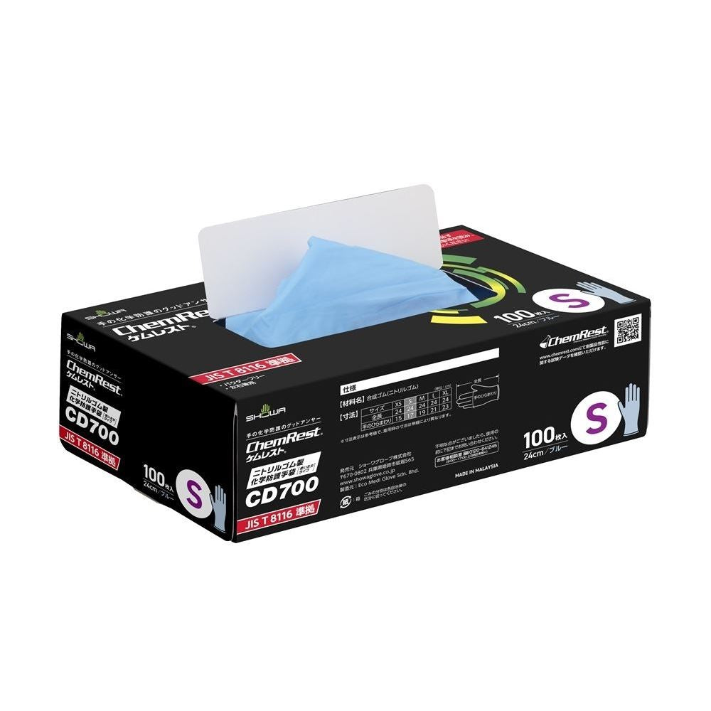 【 ショーワグローブ CD700-S CD700 ニトリルゴム製化学防護手袋 使いきりタイプ ブルー S 100枚入 使いきり手袋 耐薬品手袋 】