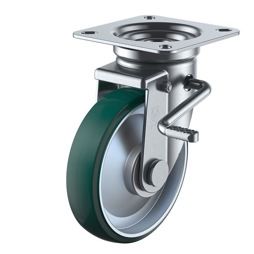 産業用キャスターダブルストッパー付 自在車 ストッパーレバー右側 車輪径:Φ100mm/車輪材質:ウレタン(B入)/ホイル材質:スチール/車輪色:グリーン 1個入